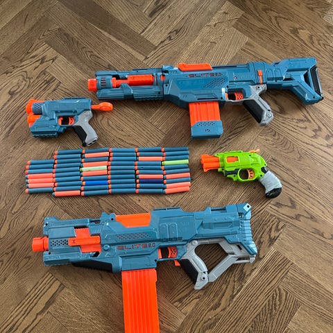 Stort paket med Nerf-blasters, skott och ”flaska” för prickskytte. Setet inkluderar 2 stora blasters och 4 mindre.