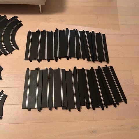 10 raksträckor PT 69 300 kr, 5 kurvor PT 56 150 kr, staket 5 st 100 kr. Handkontroller 2st 150 kr.