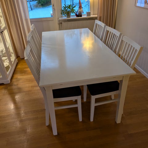 Säljer nu vårt matbord pga flytt. Bordet är i gott skick men har några skavanker. Passar lika bra till vardags som till fest tack vare den smidiga iläggsskivan.