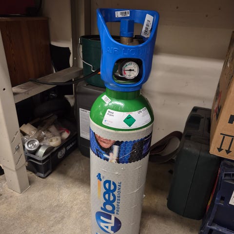 Svetsutrustning med flera gasflaskor, slangar och olika munstycken. Utrustningen är avsedd för svetsning och skärning med gas. Innehåller regulatorer och handtag för gasstyrning.