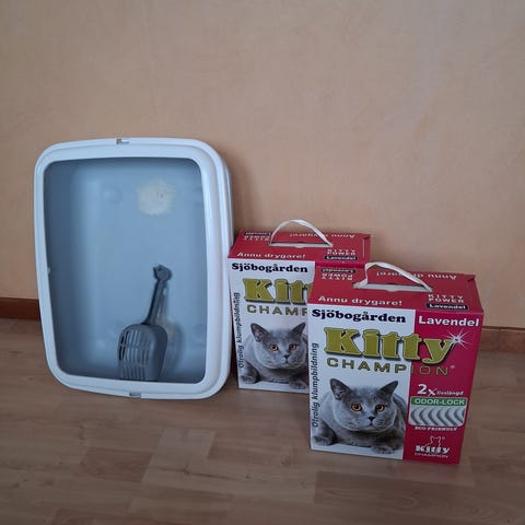 Nästan nya kattsaker. Kattlåda,sovkoja och matskåls underlägg.