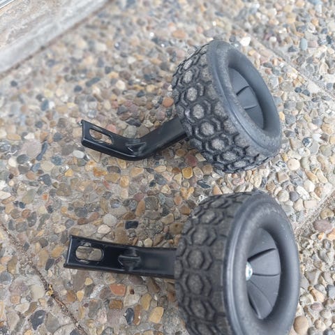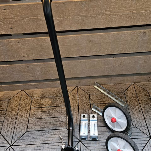 Ett set med stödhjul och hjälphandtag/dragstång/cykelpinne för att hjälpa barn att lära sig cykla. Passar de flesta barncyklar.