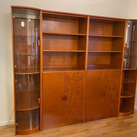 TV-bokhylla i Teak från mitten 1960-talet i fint skick. Mått [mm]: B 2400, D 450/250, H 1830. Originalkvitto finns.