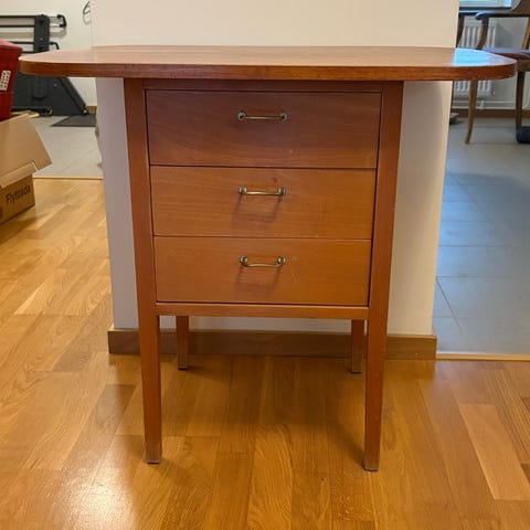 Teak bokhylla, teak byrå, skrivbord och säng