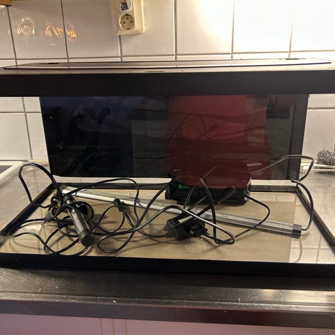 Akvarium med tillhörande stativ. Akvariet är placerat på ett svart stativ med förvaringsutrymme. Produkten är avsedd för uppfödning eller visning av vattenlevande djur och växter.