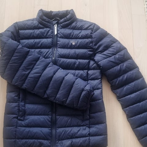 GANT barnjacka i storlek 152, unisex. Jackan är blå och tillverkad av nylon. Den har en vadderad design med huva och dragkedja framtill. Passar för barn och är lämpad för kyligare väder. Några tecken på användning, till exempel det som syns på sista bilden