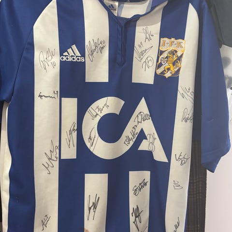 Nike AIK T-shirt i vitt, storlek M, tillverkad i Dri-FIT-material. T-shirten är signerad av flera personer och har tryck med AIK och Nike-logotyp.