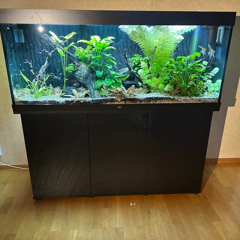 Eheim akvarium med lock och belysning. Inkluderar filter och dekorationer. Akvariet är lämpligt för mindre vattenlevande djur och fiskar.