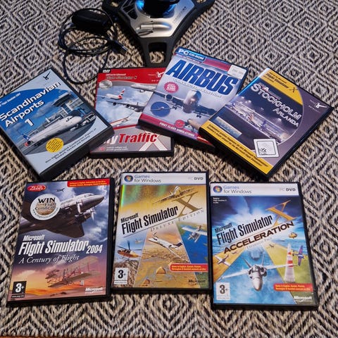 Säljer ett större paket med klassiska PC-spel, främst flyg-, helikopter- och militärsimulatorer. Totalt cirka 25 olika titlar, vissa i originalkartong, andra i DVD/CD-fodral eller med lös skiva. Säljs helst som paket. Jag kan inte garantera spelens kompatibilitet med senare Windows-versioner. Jag har inte testat spelen. Originalspel. Kommer från dödsbo. Finns att hämta nära Korsvägen i Göteborg.