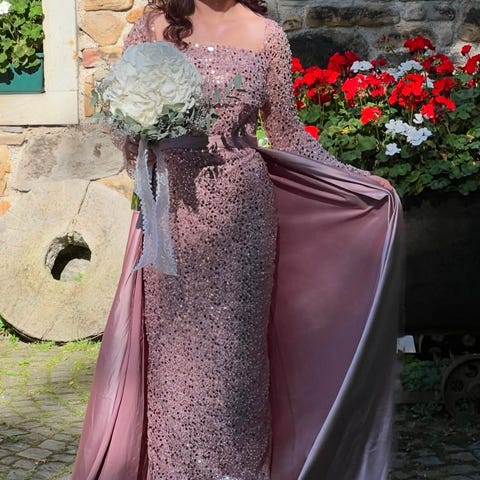 Festklänning i siden för kvinnor i storlek S och färgen rosa. Klänningen är designad för festliga tillfällen och har en lång modell med detaljer som framhäver dess elegans.