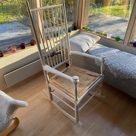 Jag hade tänkt klä om sits o nackkudde men det blir inte av. Säljer därför gungstolen som i övrigt är hel. Modell " Isabella" Gemla. Längd 56, bredd 73, sitthöjd 40, rygghöjd 1096 cm.