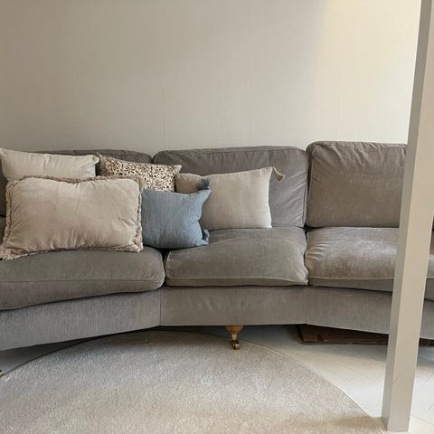 Väldigt fin howardsoffa (3 sittkuddar, 3 ryggkuddar) i ljusgrå klädsel. En klassisk, lättsvängd, väldigt vacker och elegant howard soffa med stilrena utsvängande ben som avslutas med metal hjul! Soffan är i väldigt bra skick och utan skador eller fläckar. Klädseln på kuddarna är avtagbar och väl rengjorda inför försäljningen!