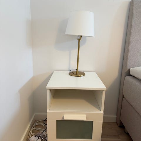 Vitt nattduksbord i bra skick. Finns några repor på ytan men inget som påverkar funktionen.