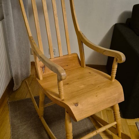 Gungstol med trästomme och klädsel i randigt tyg i olika bruna nyanser. Stolen har armstöd och en sittdyna för extra komfort. Passar för inomhusbruk som vilostol eller läsfåtölj.