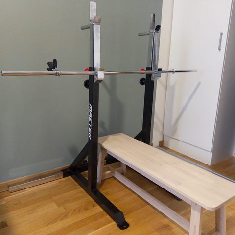 Gymutrustning bestående av en bänkpress med skivstång och vikter samt ett set hantlar i olika storlekar. Utrustningen är avsedd för styrketräning och kan användas för olika övningar som bänkpress, bicepscurl och andra muskelgruppsträningar.