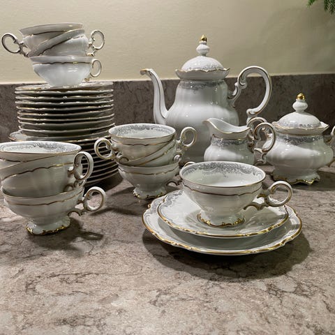 Kaffeservis från Karlskrona Porslinsfabrik/Upsala Ekeby, serie nr. 5016. Servisen består av 10 st kaffekoppar, (drickvolym ca 10 cl, höjd ca 7,5 cm) 13 st kaffefat (diameter ca 13 cm) och 12 st assietter (diameter ca 17,5 cm). Allt i fint skick.