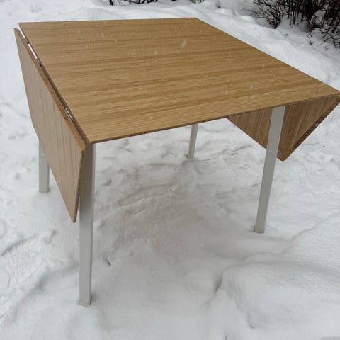 Mindre bord i bambu med vita ben i metall. Perfekt storlek för ett litet kök. Det finns en del smårepor i bordsskivan men i övrigt fint skick.