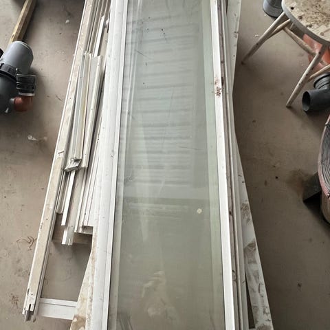 Fönster med stora glaspartier i flera delar, inklusive ett smalt fönster och två stora fasta fönster. Fönstren är avsedda för installation i bostad och ger mycket ljusinsläpp.