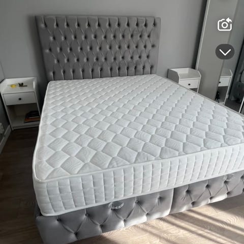 Sängen har en tuftad sänggavel och är stadig. Madrass ingår. Sängen är i fint skick och sparsamt använd.