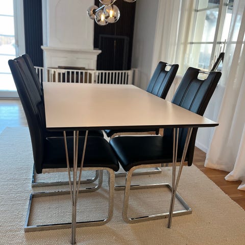 Köksbord + två stolar. Skicket är mycket bra, dynorna ingår.