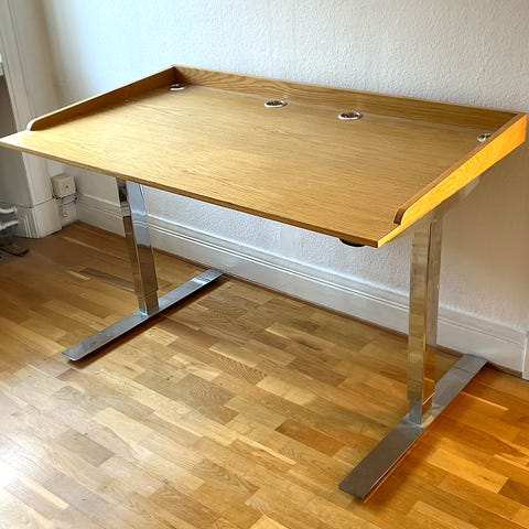 Stabil konstruktion med elektrisk höj och sänkfunktion, perfekt både för sittande och stående arbete. Skivan har en varm och exklusiv träkänsla som passar bra i både hem och kontorsmiljö.