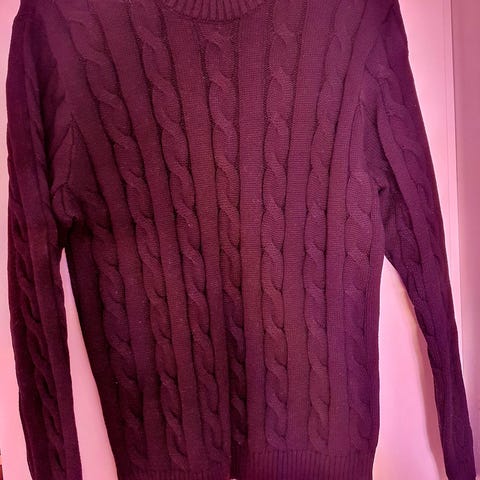 En vit stickad tröja med ett flätat mönster. Tröjan har en rund halsringning och ribbstickade muddar.