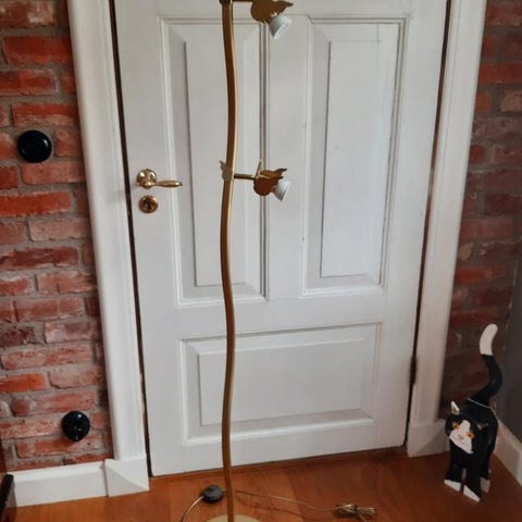Golvlampa i mässing med svart skärm. Inköpt på Auktion. Ny el.