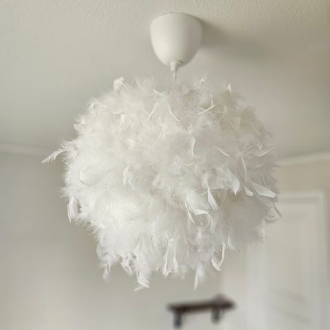 Mio taklampa med fjäderdetaljer. Lampan är rund och hänger i taket. Den ger ett mjukt och dekorativt ljus och är avsedd för inomhusbruk. Mycket bra skick. Köpt för 1295kr på Mio.