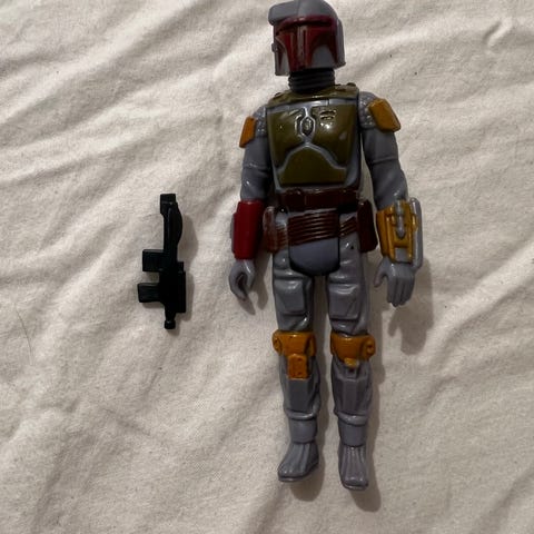 Säljer en sällsynt gammal Star Wars Boba Fett figur. Figuren står på en basplatta. Se bilder för detaljer. Inga skador. Som ny. Mycket detaljrik!