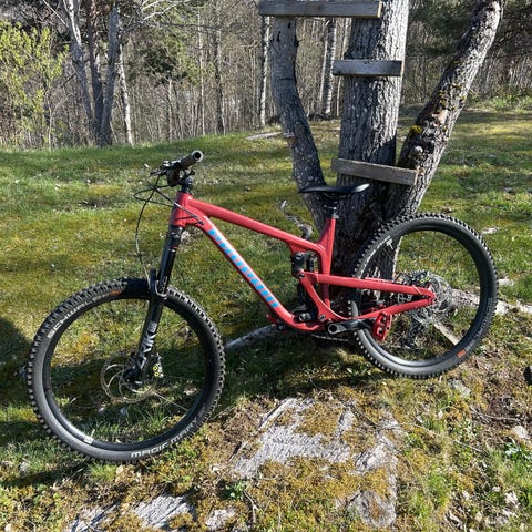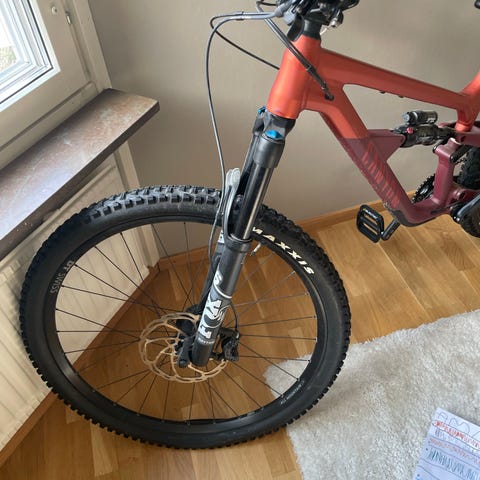 Rockshox lyrik där fram och superdelux coil där bak. Shimano slx drivlina och sram code bromsar. Står på det Swiss hjul med fina maxxis däck. Finns en dropperpost som skulle behöva lite service innan den är i fullt skick