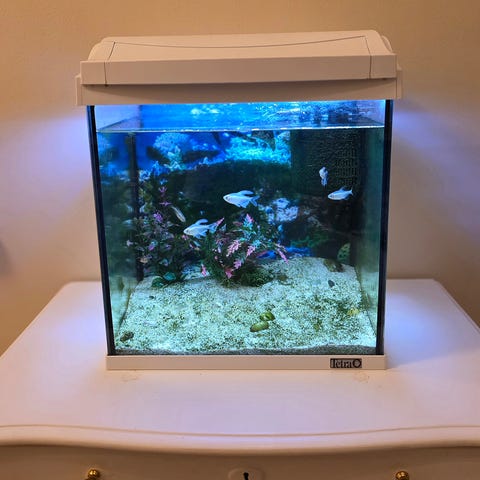 Komplett fungerande 60 liters akvarie med inbyggd belysning, pump, ställbar doppvärmare, mat, behandlings medel, vitaminer, lite dekoration, magnetrengörare. Ett Aquael hexaset II akvarie medföljer om man vill ha som extra. Ingen lampa eller pump till det dock.