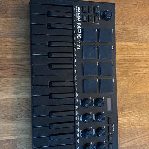 Akai MPK mini MIDI Keyboard med 25 tangenter, 8 trigg-pads och 8 rattar. Svart färg och kompakt design för musikproduktion och liveframträdanden.