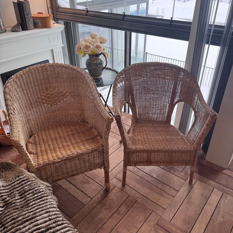 Stol med ram i rotting och överdrag i grått fårskinn. Passar för inomhusbruk som matstol eller extra sittplats. Två stycken stolar med armstöd och mjukt fårskinnsöverdrag för komfort.