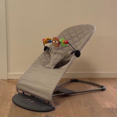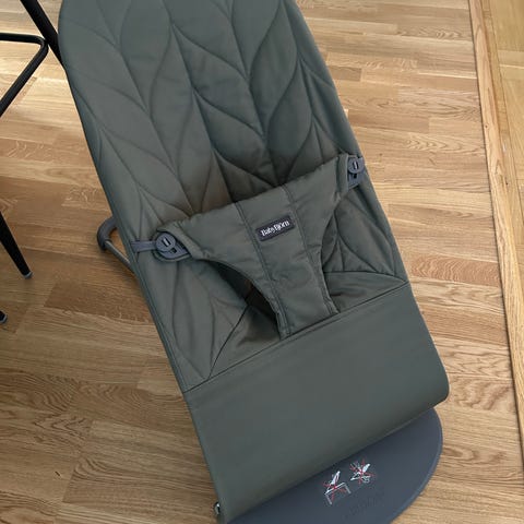 En väldigt snygg babysitter som heter Bliss Classic Quilt Sand Grey från BabyBjörn. Alltid haft skydd över så inte en enda fläck på tyget, alltså i otroligt fint skick!