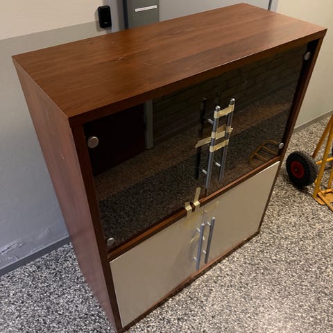 Ett högskåp med glasskivor, lådor och ett skåp så väldigt mycket plats för förvaring. Hel och ren utan märken och annat. Belysning finns. Finns att hämta i Munkebäck (bärhjälp behövs).