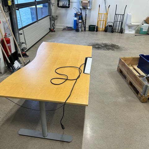 skrivbord med vit yta och svart kontorsstol. Skrivbordet är placerat i ett mindre arbetsrum med hyllförvaring och arbetsmaterial runt omkring. Kontorsstolen är svart och har armstöd.