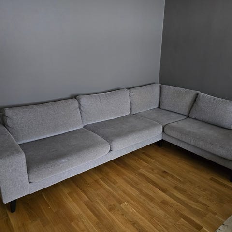En fyrsittsoffa med divan. Fin i grått tyg med en lång divan så att fötterna inte sticker utanför kanten. Ca 5 år och lite mer använd vid divandelen. Bra djup i sittdelen så om man tar bort ryggstöden funkar den utmärkt för besökare att sova i.