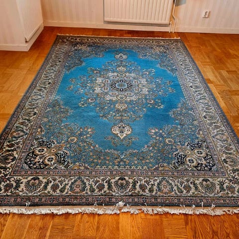 Fin, mjuk och tjock matta köpt av min pappa för 8000:- Fin kvalité men några skönhetsfläckar som borde gå att tvätta bort. Mattan är gammaldags rosa i fina toner och väldigt fin.