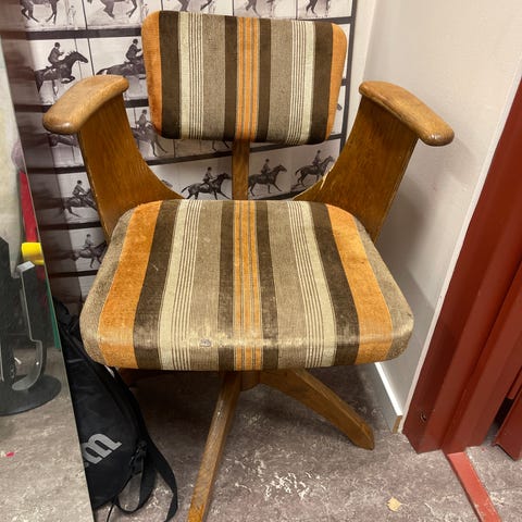 Fantastisk antik skrivbordsstol/snurrstol från tidigt 1900-tal i mörkt trä. En del små märken/skav från årens användning.
