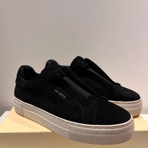 Skorna är svarta med vita detaljer och har märkets logotyp tydligt placerad. Materialet är mjukt och flexibelt
