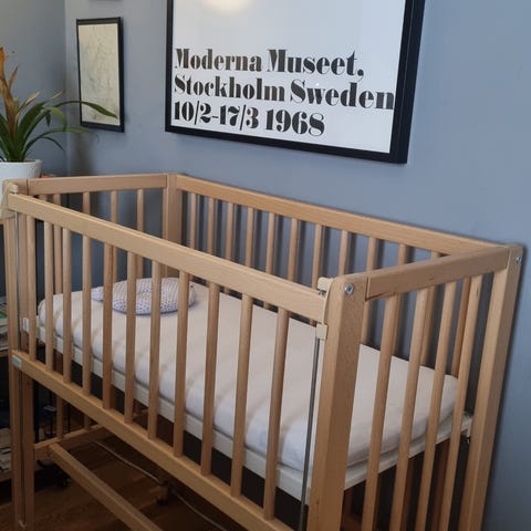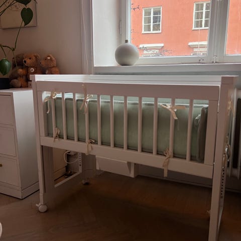 Säljer vår fina och stabila bedside crib från Filikid. Nypris 1600kr. Använd som bokhylla eftersom mitt barn vägrade sova i den. Kommer med madrass och spjälskydd från NG baby. Hjul och band som ska sättas runt vuxensängen medföljer. Små skav men inget som påverkar den generella looken. Förra ägaren har satt ett stabiliserande golv längst ned.