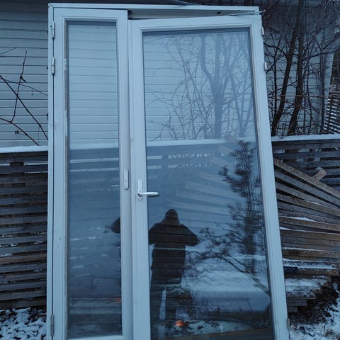 Fönsterdörr Trä med utvändig aluminiumbeklädnad, 9x22, Vänsterhängd. Finns 6 st. Invändigt handtag, utvändigt draghandtag. Pris: 4950:- /st