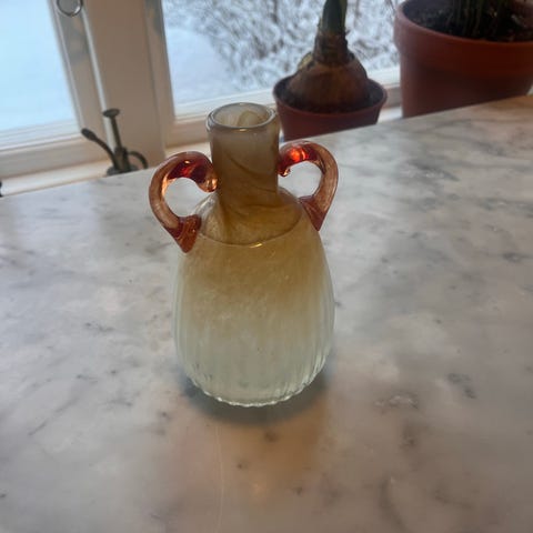 Bärnstensfärgat glas i färgerna mörkröd, brunt och guld. Inga nagg så vitt jag kan se. Signerade av den norske konstnären Benth Owesen 2012.