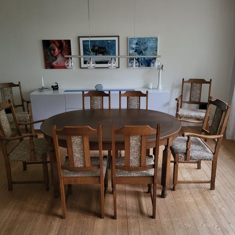Ett matbord i trä med två iläggsskivor. Perfekt för både vardag och fest.