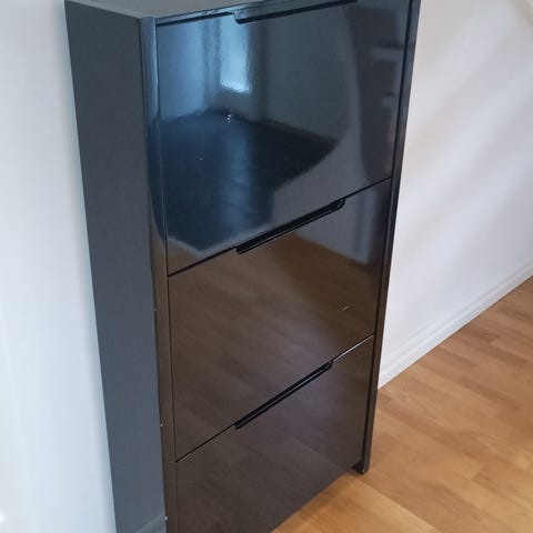 Säljer vit skohylla. Mycket praktisk, 3 st fack + 1 låda högst upp (ryms ca 12 skor tot).