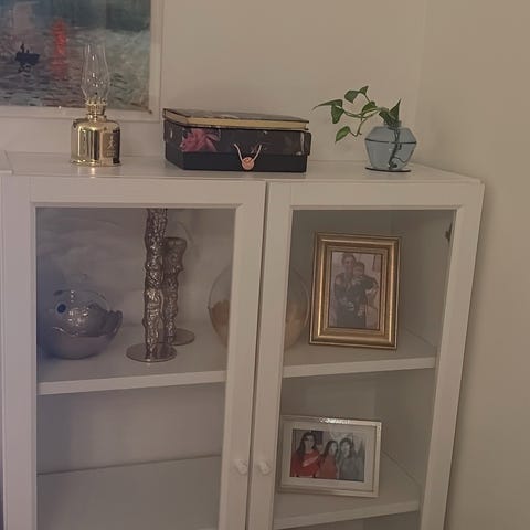 IKEA vitrinskåp med glasdörrar och hyllor i glas, Skåpet är utformat för att visa och förvara föremål som glas och flaskor. Passar som förvaringsmöbel i hemmet.