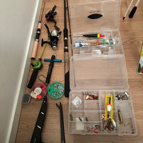 Fiskeutrustning med spön, rullar, håv och tillbehör