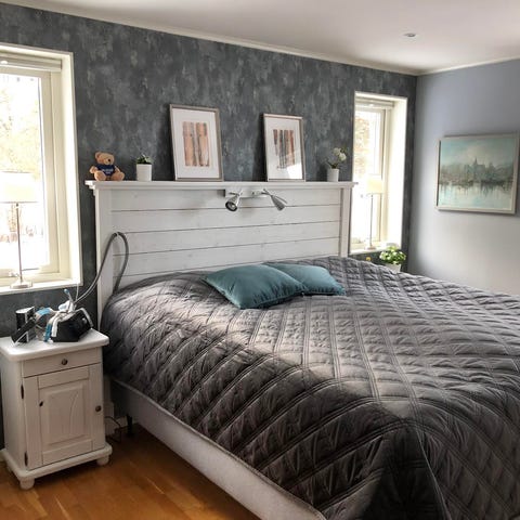 Ett turkos Vändbart överkast från IKEA, modell Karit. Mått: 260x280/matt på orngött 40x60 cm. Material: 100% polyester.