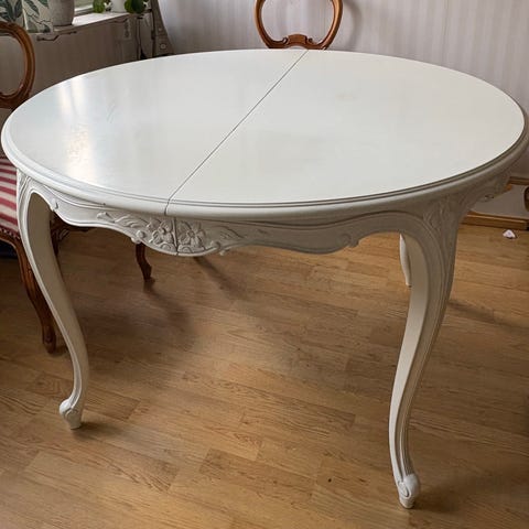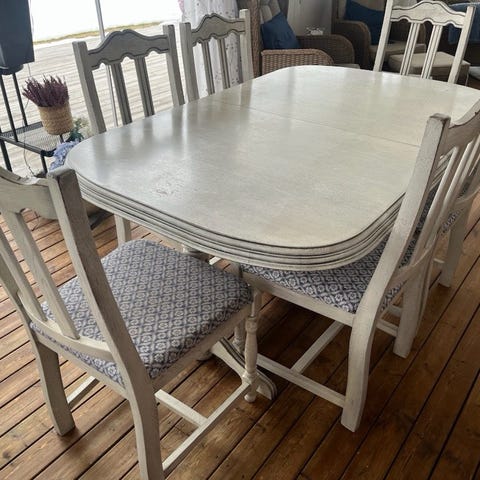 Matsalsgrupp bord samt 4 stolar. Bordet har 3 iläggskivor.
