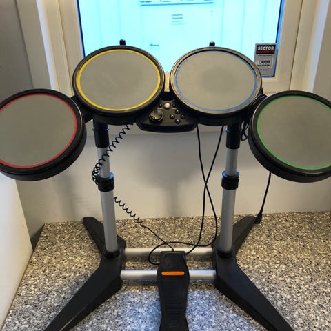 Rock Band trumset spelkontroll med fyra trummor, utrustad med färgade ringar i blått, grönt, gult och rött. Används som tillbehör till musikspel på spelkonsol.